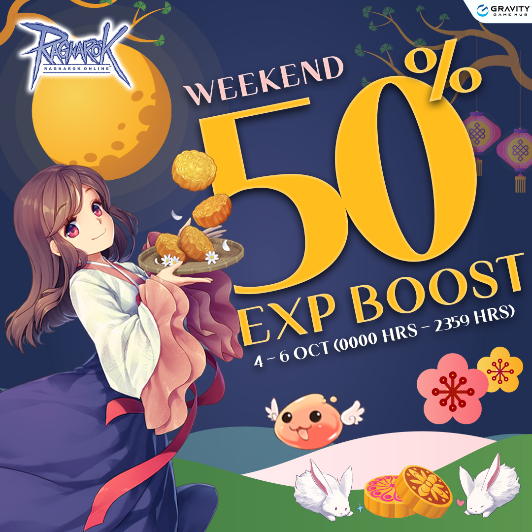A special server-wide 50% experience boost will be available from Oct 4, 0000hrs to Oct 6, 2359hrs.The boost can be stacked with experience manuals. Please enjoy!