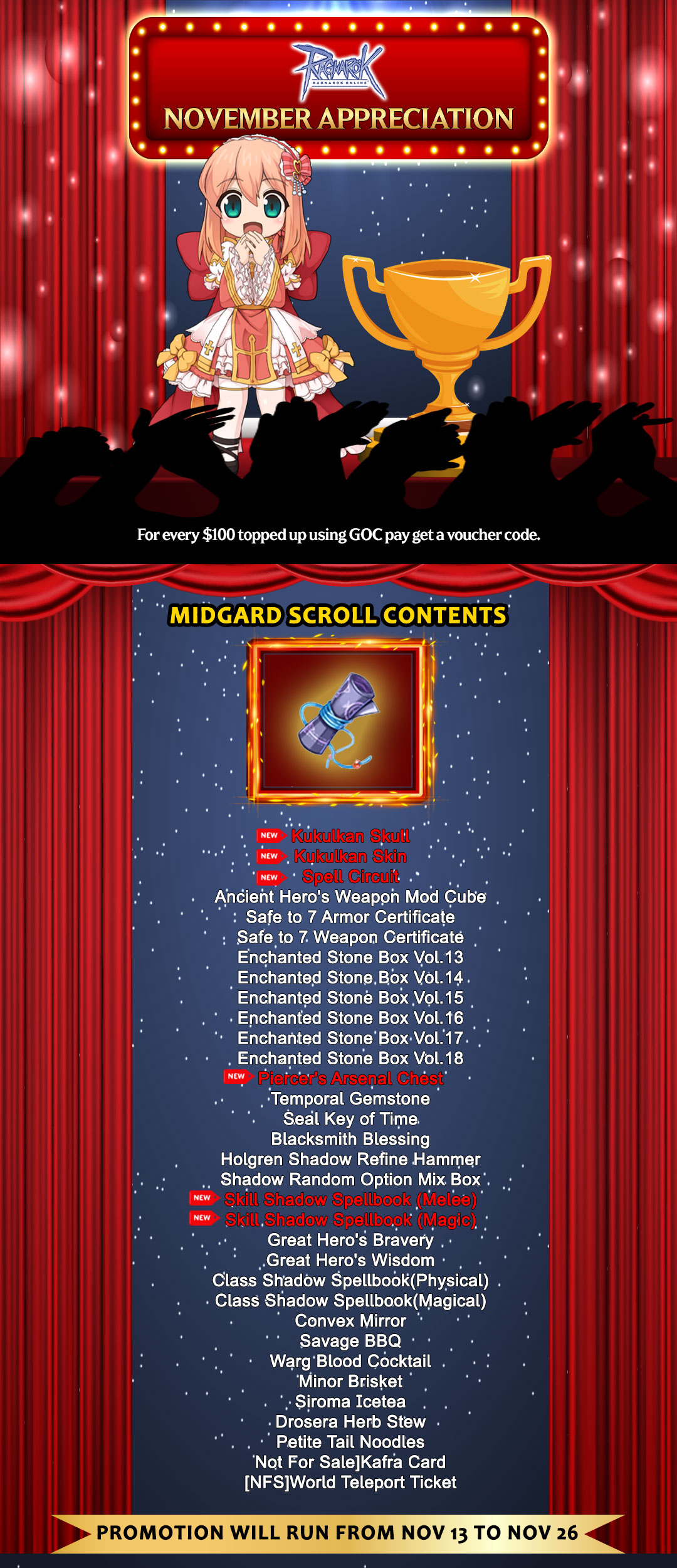 Top up using GOC Wallet and get a Voucher Code that contains 10 Midgard Scrolls ! Also, get a 5% cashback on your GOC Wallet.