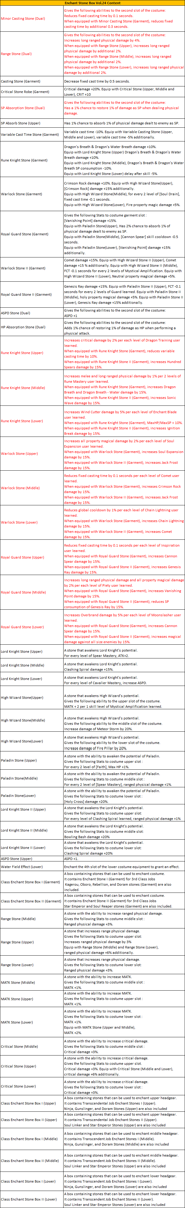 Bring your new costumes to Designer Heidam in Malangdo and you can receive Enchant Stone Box Vol.24.When you've received the effect stones, speak to Gurjio Gurmani to use it.Click here for new costumes.Enchant Stone Box Table